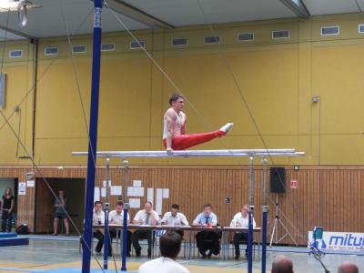 Am Freitag startete bereits Dominik Prosch von der Uni Erlangen-Nürnberg bei der DHM der Männer. Gewertet wurde gemäß aktuellem Code de Pointage (CdP). Nach einem erfolgreichen Kür-Sechs-Kampf an den Geräten Boden, Seitpferd, Ringe, Sprung, Barren und Reck konnte sich Dominik Prosch über einen stolzen 2. Platz freuen. Gewinner dieser Meisterschaft war Helge Liebrich von der Uni aus Schwäbisch-Gmünd. Zudem qualifizierte sich D. Prosch für fünf Gerätefinals, bei welchen er der Uni zwei 2. Plätze (Barren, Reck) zwei 3. Plätze (Ringe, Pferd) und den 5. Platz am Boden einbrachte. Souverän zeigte er seine Kür am Reck, seiner Paradedisziplin: mit einer Tkatschev-Grätsche (Kontergrätsche über die Stange in den Hang) turnte er eine Höchstschwierigkeit, die an diesem Tag nur einmal zu sehen war.