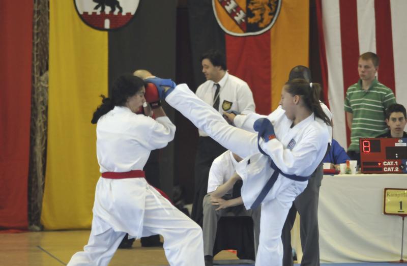 Etwa 250 Karatekas aus allen Bundesländern waren in den Berliner Stadtteil Wedding gekommen, um ihre deutschen Meister im Kata (Formenlauf) und im Kumite (Freikampf) zu küren. Unter ihnen auch Claudia Leffler, Elektrotechnikstudentin an unserer Hochschule im 6. Semester. Gemeldet hatte die 22-Jährige, die seit über zehn Jahren den Karatesport betreibt und den schwarzen Gürtel (1. Dan) trägt, für den Freikampf in ihrer Gewichtsklasse +68 kg und in der Allkategorie. Der Wettkampf begann für Claudia mit dem Start in der Gewichtsklasse, in der sie sich bis ins Halbfinale kämpfte. Dort fand sie allerdings nicht die richtige Einstellung zu ihrer Gegnerin. Hinzu kamen einige strittige Entscheidungen des Kampfrichters, was nicht zur Stärkung des Selbstvertrauens beitrug und zudem die Kampfstrategie schwierig machte. So ging dieser Kampf im Halbfinale am Ende doch recht klar verloren. Trotz der gewonnen Bronzemedaille war Claudia mit dem Ausgang dieser Begegnung nicht ganz zufrieden, zumal eine mögliche Finalteilnahme in greifbarer Nähe war.
