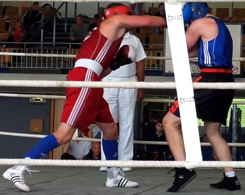 Foto 1 Finalkampf im Mittelgewicht B-Turnier: Matthias Büchner (rot) mit einer rechten Geraden gegen Bastian L. (blau):