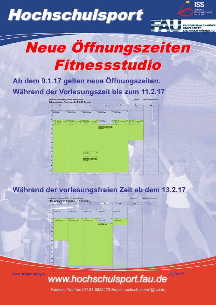 wir haben ab sofort neue Öffnungszeiten für den Rest der Vorlesungszeit im Fitnessstudio am ISS.