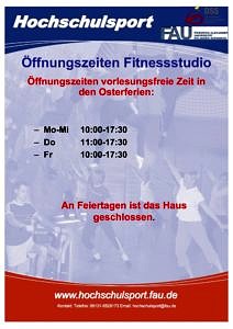 23. März 2018 Wir bitten um Verständnis, dass in den Osterferien das Fitnessstudio nur zu folgenden Zeiten geöffnet ist. Kategorie: Aktuell / Current