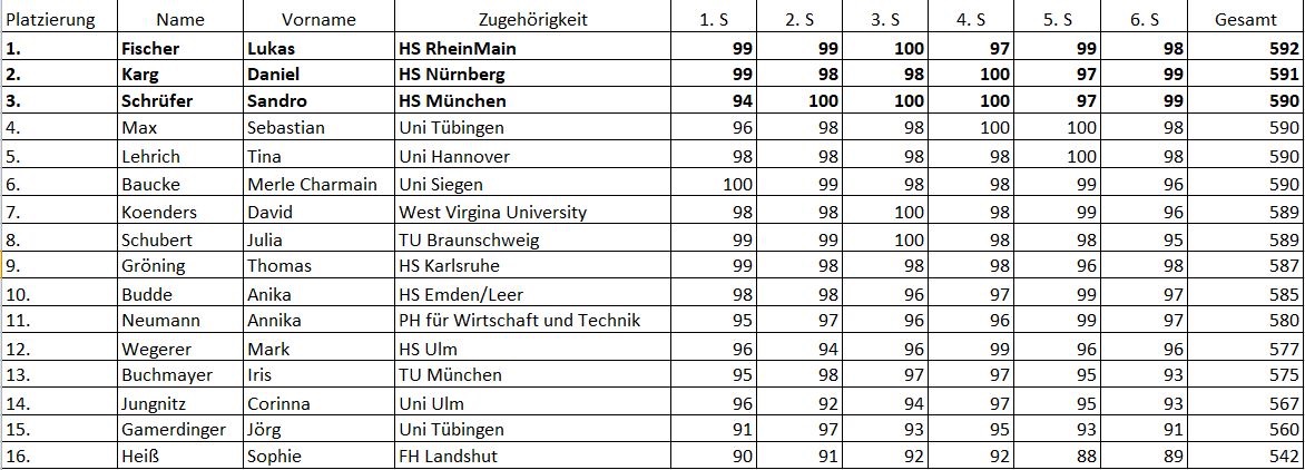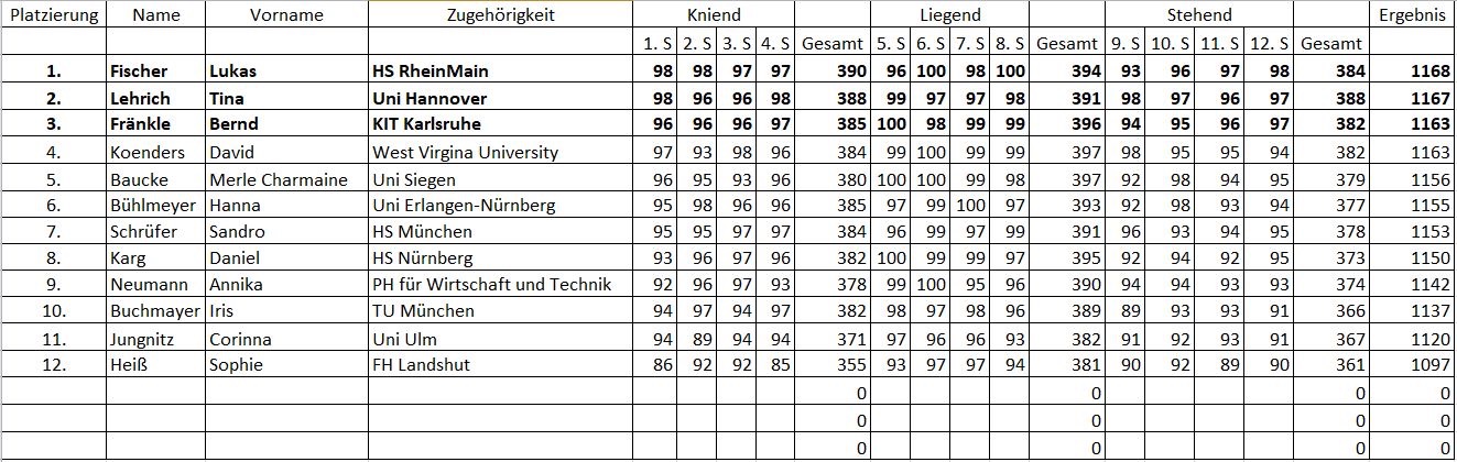 Die diesjährige DHM Sportschießen wurde von der Sportuniversität Tübingen vom 17.05. -19.05.19 organisiert. Am Ankunftstag fand eine Stocherkahnfahrt über den Neckar durch die schöne Stadt Tübingen statt. Die Sportler nutzten die Möglichkeit in der Turnhalle der Universität zu übernachten, an welcher auch ein gemeinsamer Grillabend statt fand. Daniel Karg und Hanna Bühlmeyer starteten am ersten Tag in der Disziplin Luftgewehr, in der beide das Finale um die Medaillen erreichten. Daniel Karg konnte sich hierbei die Bronzemedaille sichern. Am selbigen Tag fand der Wettkampf in der Disziplin Kleinkaliber liegend statt, bei der Daniel Karg den zweiten Platz erreichte. Der letzte Tag wurde mit der Disziplin Kleinkaliber Dreistellungskampf beendet. Hier mussten sich Karg und Bühlmeyer der starken Konkurrenz ihrer Kaderkollegen trotz soliden Ergebnissen geschlagen geben.