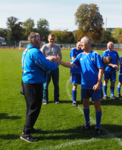 Dieses Jahr gab es bei dieser Zusammenkunft gleich mehrere besondere Jubiläen zu feiern. So fand im Jahre 1921 genau auf dem Boden der diesjährigen Begegnung vor 100 Jahren die erste fussballerische Begegnung zwischen der Uni Erlangen und der Uni Jena statt. Im Jahre 1991, also vor 30 Jahren, trug man das erste gemeinsame „Trainingslager“ der beiden befreundeten Teams aus. Und als weiterer besonderen Anlass und Rahmen wurde der runde Geburtstag desjenigen gefeiert, der diese Sportfreundschaft wie kein anderer auf Jenaer Seite geprägt und gelebt hat: Wilhelm Tell durfte wenige Tage zuvor seinen 80. Geburtstag bei bester Gesundheit feiern. So gab es bereits vor Spielantritt entsprechende Laudatien. Unter anderem gratulierte die Geschäftsführung des USV Jena dem langjährigen Spieler, Mannschaftsleiter, Abteilungsleiter USV Fussball und Geschäftsführer des Unisportvereins Jena. Er ließ es sich auch nicht nehmen, in der Hintermannschaft des USV aufzulaufen und mit gewohnter Übersicht die Abwehr zu organisieren.